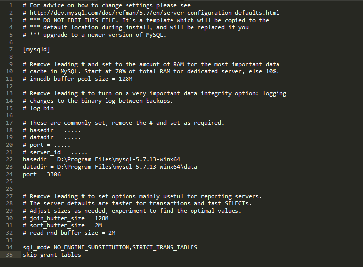 密码修改完成后,将my.ini文件中添加的 skip-grant-tables 语句注释或删除掉,然后重启数据库即可,现在就可以正常使用密码登录了。