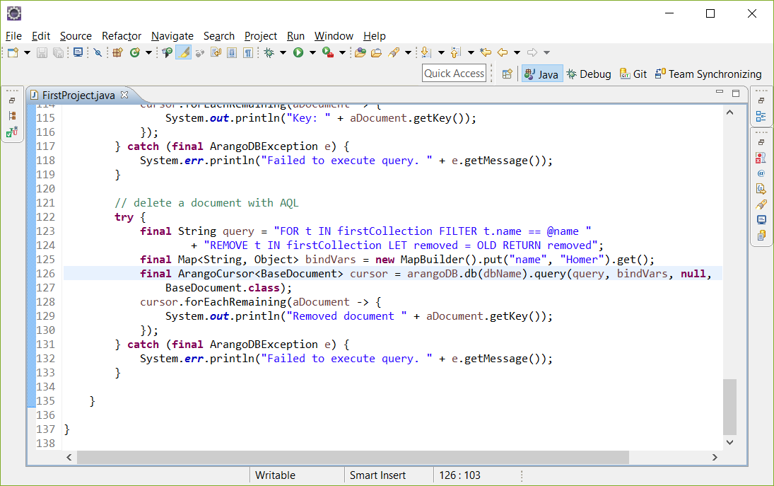 String query = "FOR t IN firstCollection FILTER t.name == @name RETURN t";